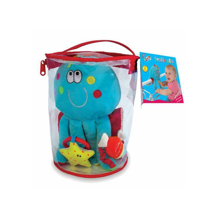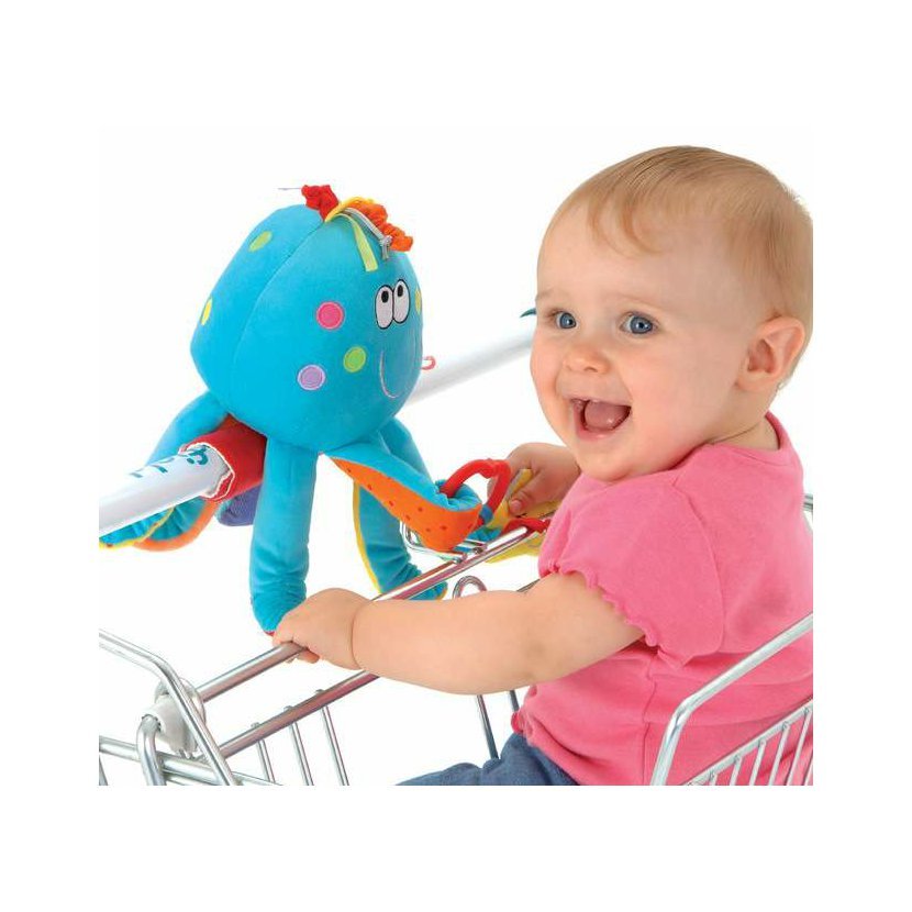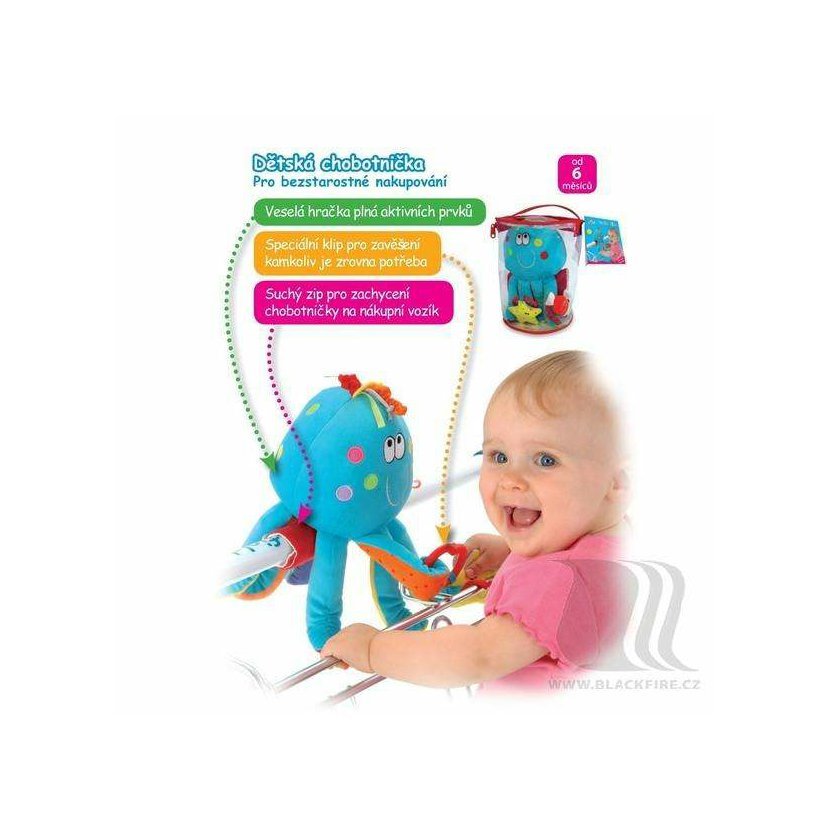 Veselá hračka plná chrastících prvků a aktivit. Chobotnička zabaví dítě při nakupování a dá rodičům dostatek klidu a času. Dá se využít i k hraní samostatně. Baleno v praktické tašce z PVC.