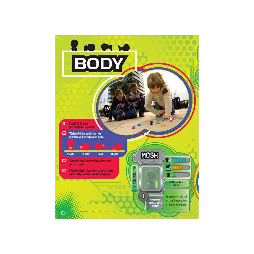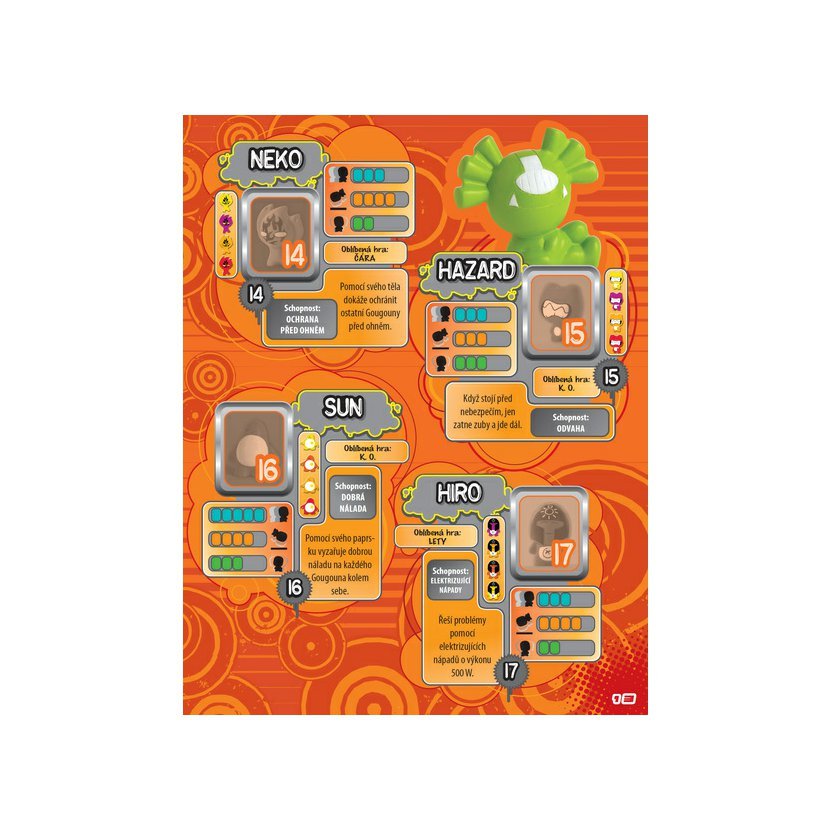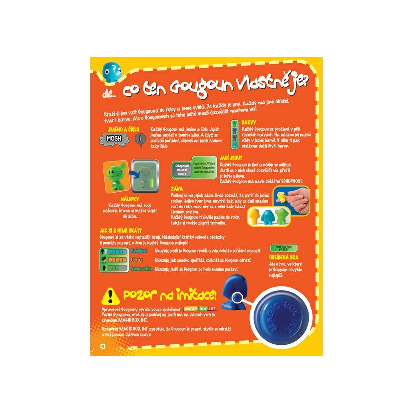 Skvělé Gougouní sběratelské album, ve kterém mimo jiné najdeš spoustu super her! Říká se, že k nám na zem spadli z nebe, prý skočili z letadla. Je to ale pravda? To netušíme. Víme ale, že jich je strašná spousta, jsou fakt skvělí, krásně barevní, je s nimi legrace a ze všeho nejvíc nesnášejí nudu! Jsou to prostě Gougouni! V tomhle albu je můžeš všechny poznat a vstoupit do jejich světa! Každý Gougoun má jméno a číslo. Jméno najdeš v albu. A když se podíváš pořádně, objevíš na zádech Gougouna také číslo. Každý Gougoun se prodává v pěti různých barvách. Na nálepce jej najdeš vždy v jedné barvě. V albu ti pak ukážeme další čtyři barvy. Každý Gougoun je jiný, něčím se odlišuje a má svoji zvláštní schopnost. Jestli se o nich chceš dozvědět víc, přečti si tohle album. Gougouni by si nejraději pořád hráli. Tak jim dopřej trochu legrace! V tomto albu ti ukážeme několik suprových her! Pracuj na technice, počítej, kolikrát se Gougoun odrazí, a zjisti, k jaké hře je který Gougoun nejlepší. Jestli si chceš ale hru pořádně užít, domluv se s kamarády, že si vítěz vyhrané Gougouny nechá. Na co čekáš – jdi do toho! Nebo si vymysli vlastní hry. Stačí mít v ruce Gougouna a jsi rázem expert na hry! Gougouni se dají i sbírat. Ve světě to je doslova sběratelská mánie! Dohromady můžeš nasbírat až 80 různých Gougounů v nejrůznějších barvách. Pokud to ale se sbíráním myslíš vážně, neexperimentuj a vyzkoušej rovnou tohle perfektní gougouní album! Každý Gougoun se prodává v pěti různých barvách a u některých tě navíc čeká speciální překvapení!