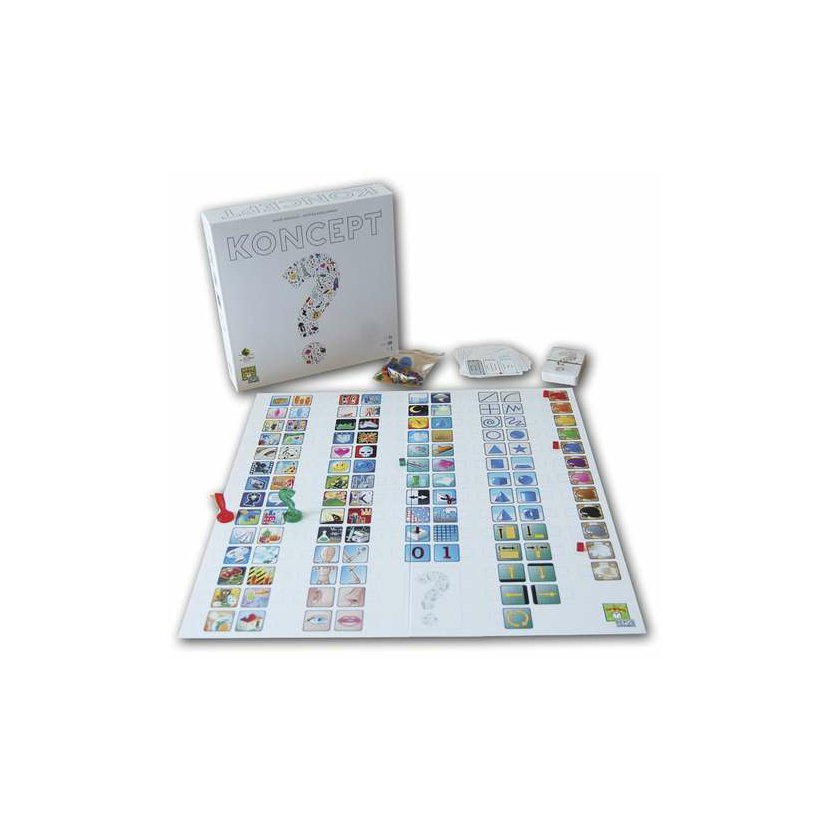Zábavná hra Koncept pro pobavení i zamyšlení. Ve hře Koncept je vaším cílem uhodnout slova naznačená pomocí nápovědy ze symbolů - konceptu. Tým složený ze dvou hráčů (sousedů u stolu) si zvolí jedno slovo nebo frázi, kterou musí ostatní hráči uhodnout. Společně pak rozmístí herní dílky na vybrané obrázky na hracím plánu. První hráč, který na základě těchto náznaků správně uhodne hledané slovo nebo frázi, získá 2 body. Vítězem se stane hráč, který získá nejvíce bodů. Obsah balení: • 1 hrací plán se symboly. • 5 sad figurek: • 1 zelená sada pro označení hlavního konceptu (velký symbol otazníku a 10 kostiček); • 4 sady (modrá, červená, žlutá, černá) pro pomocné koncepty (symbol vykřičníku a 8 kostiček). • 110 karet konceptů, každá s 9 slovy/frázemi ve třech obtížnostech – lehké, těžké a výzva. • Jednoduché a dvojité žetony vítězných bodů (dvojitý žeton má hodnotu 2 bodů, jednoduchý pouze 1 bodu). • 2 herní přehledy. • 1 miska na uskladnění.