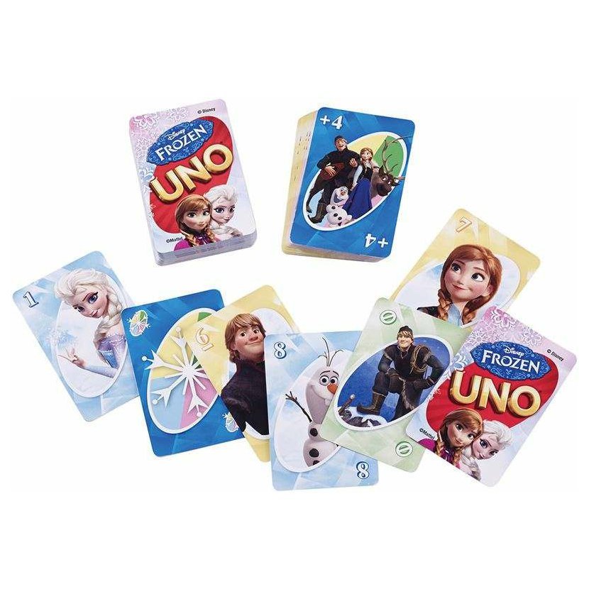 Klasická hra UNO dostává s Disneyho Ledovým královstvím úplně jiné grády! Je zde přidáno nové pravidlo a jemu odpovídající 4 karty, které tě dostanou! Vyzkoušej nové momenty, které změní celou hru! Sněhulák Olaf miluje vše, co je spojené s létem, to znamená, že má rád letní barvy, jako je růžová a žlutá. Když máš v ruce Olafovu letní kartu, můžeš odhodit až tři růžové nebo žluté karty najednou! Dále můžeš „zmrazit“ svou konkurenci díky kartě „vezmi si dvě“ nebo kartou „jedno kolo nehraješ“! Fanoušci filmu budou nadšeni designem karet, na nichž poznají své oblíbené hrdiny, jako jsou Anna, Elsa a Kristoff! Hlavní však zůstává stejné, pokud máš v ruce poslední kartu, nezapomeň zakřičet „UNO“! Hra obsahuje 112 karet a pravidla. Hra je určena pro 2 až 10 hráčů.