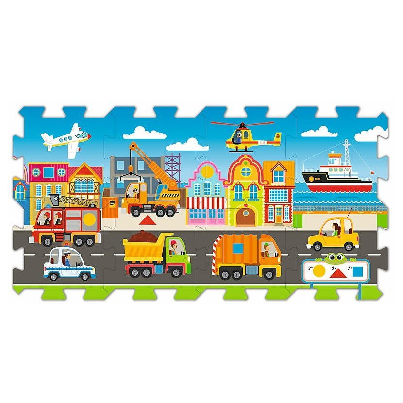 Krásné pěnové puzzle s na téma dopravní prostředky. Velikost složeného obrázku 117,5 x 60,5 cm. Velikost 1 dílku cca 28 c, tloušťka cca 1,5 cm. Puzzle učí: - vnímání - rozpoznávání barev a tvarů - budování prostorových tvarů - fantazii Z dílků můžete složit kostku či obrázek. Složené lza použít i jako podložku. V případě znečištění stačí setřít vlhkým hadříkem.
