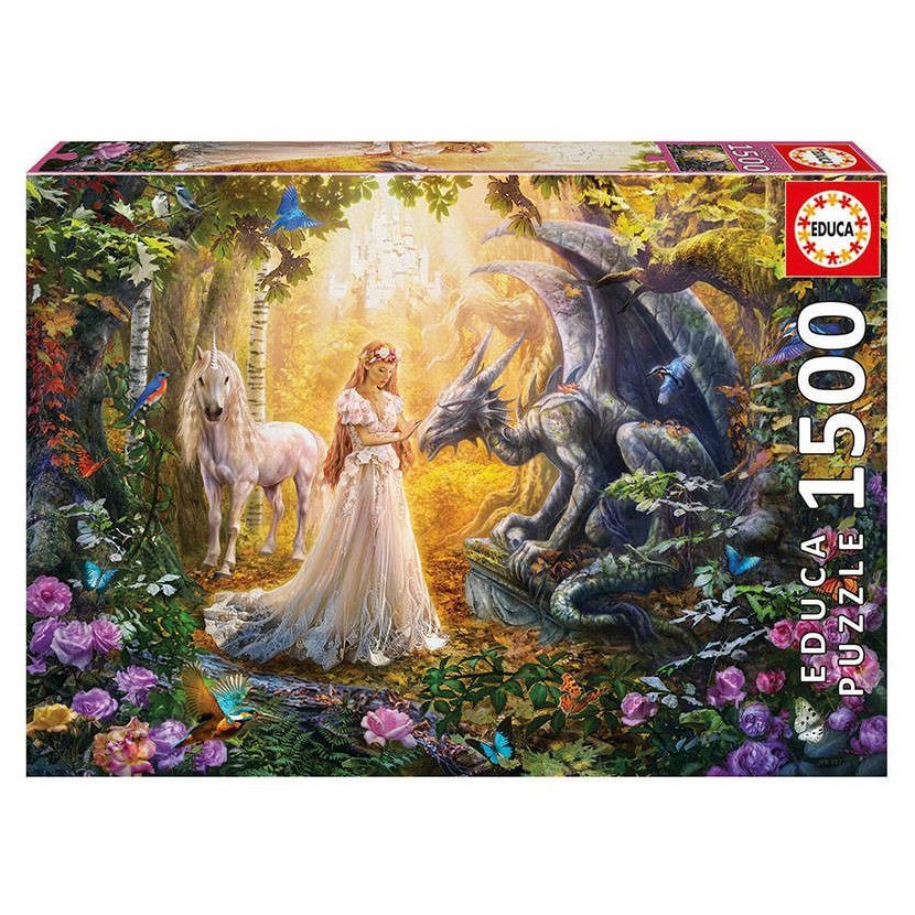 Kvalitní puuzzle značky Educa 1500 dílků s motivem jednorožce s princeznou a drakem