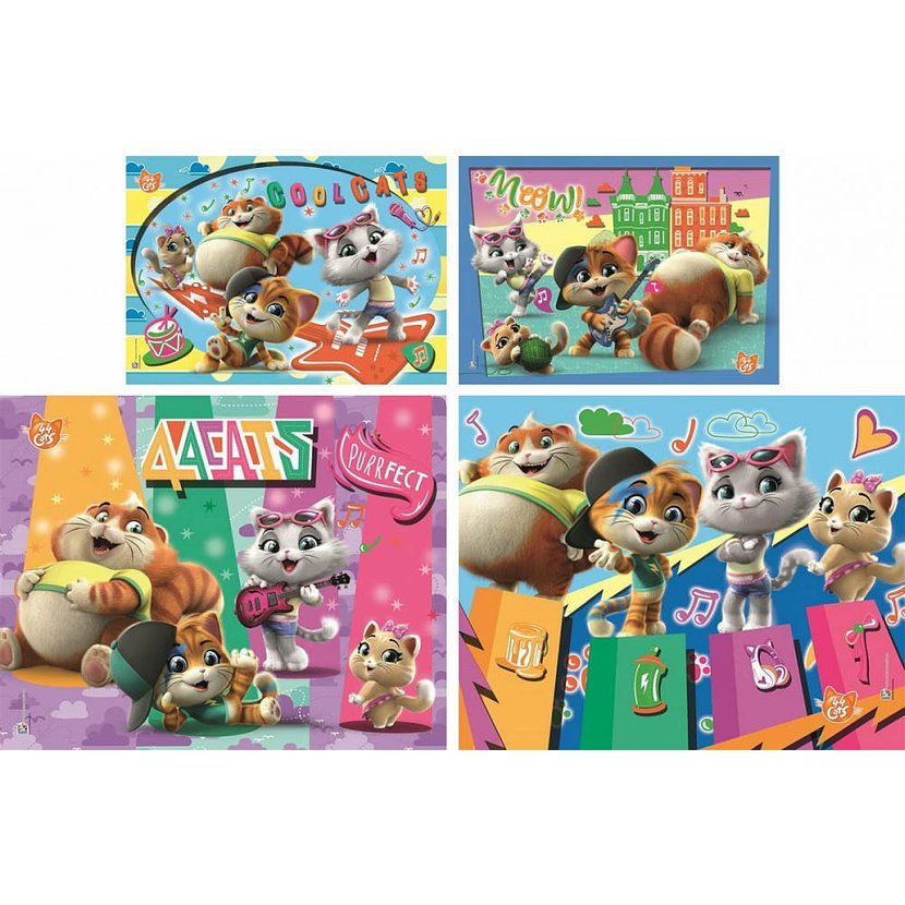 Puzzle s motivem 44 Koček. Velikost složeného obrázku - 2x je obrázek 30x19 cm a 2x je obrázek 38x30 cm. Vhodné pro malé děti, přibližně od 5 let.