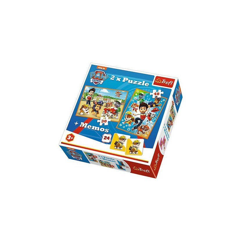 Puzzle a memo (pexeso) z kolekce Psí tlapková patrola. Balení obsahuje 1x puzzle s 30 dílky, 1x puzzle se 48 dílky a 24 karet na memo.