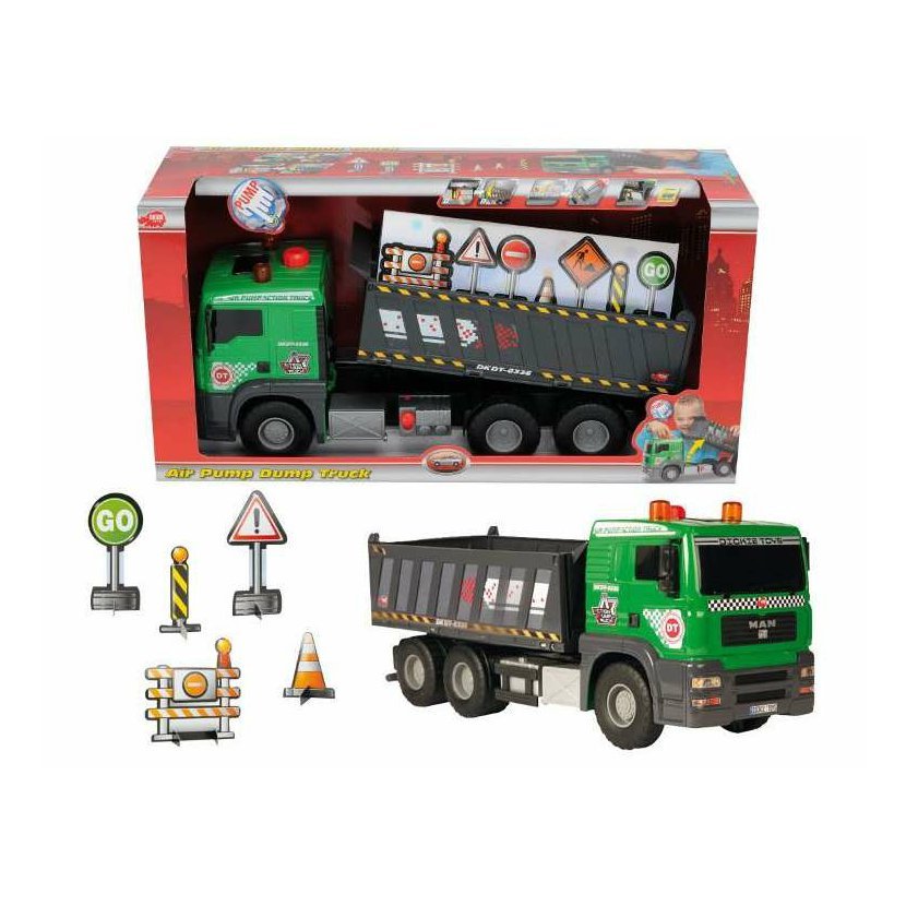 Sklápěčka na volnoběh. Vzduchové čerpadlo vyklopení nákladu. Dopravní značky součástí. Délka 55 cm.