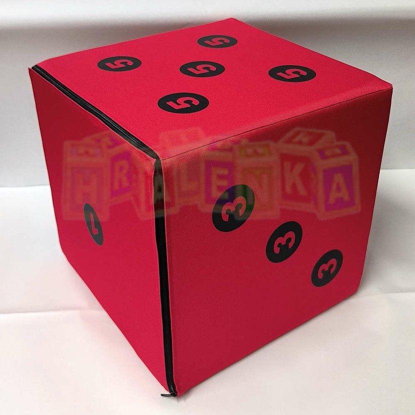 Velká červená sedací kostka s puntíky v barvě černé s čísllicemi 1 až 6. Kostka je vhodná nejen na hraní pro děti, ale i na sezení. Je pevnější - výplň je tvrzený molitan. Potah kostky je zhotovený z pevné tkaniny s polyesterem, omyvatelný a na zip.