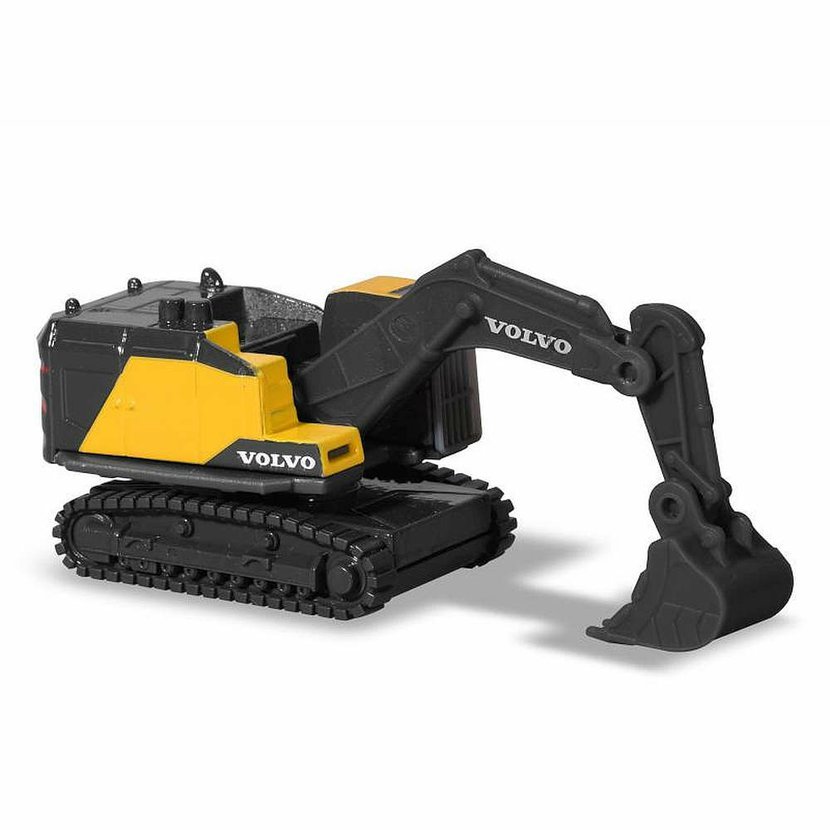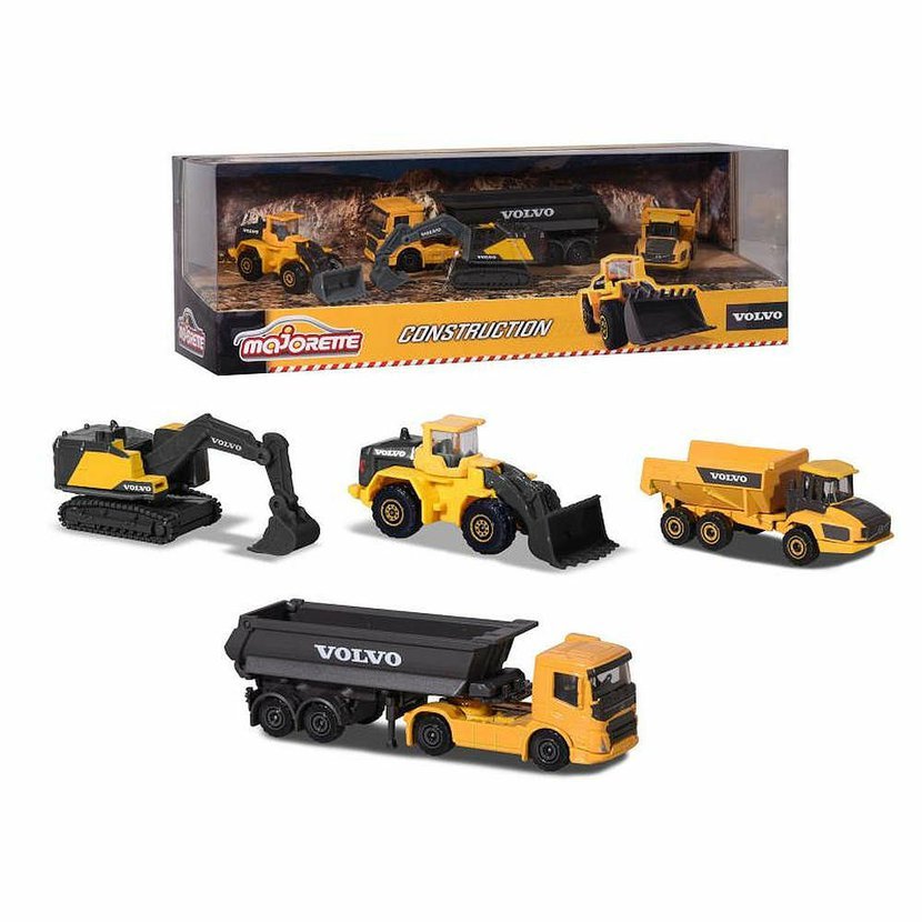 Volvo Edice dárková sada 4 kovových aut a stavebních mechanismů na volnoběh (pásové rýpadlo, kolový nakladač, dampr, tahač s korbou), s otevíracími částmi. Délka autíčka 7,5 cm.